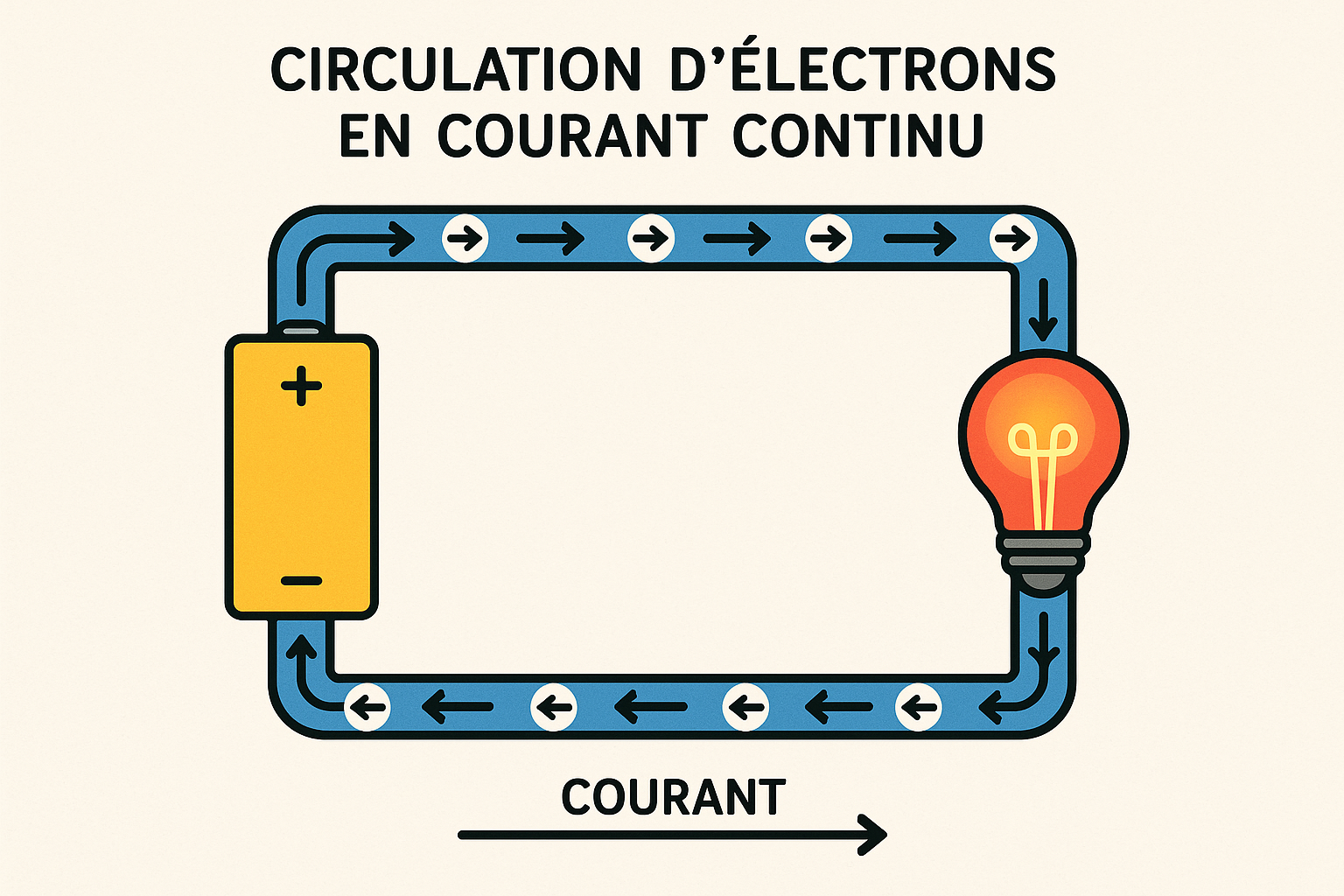 Le courant continu est un type de courant électriques ou les électrons circulent tous dans le même sens, de la borne négative a la borne positive.